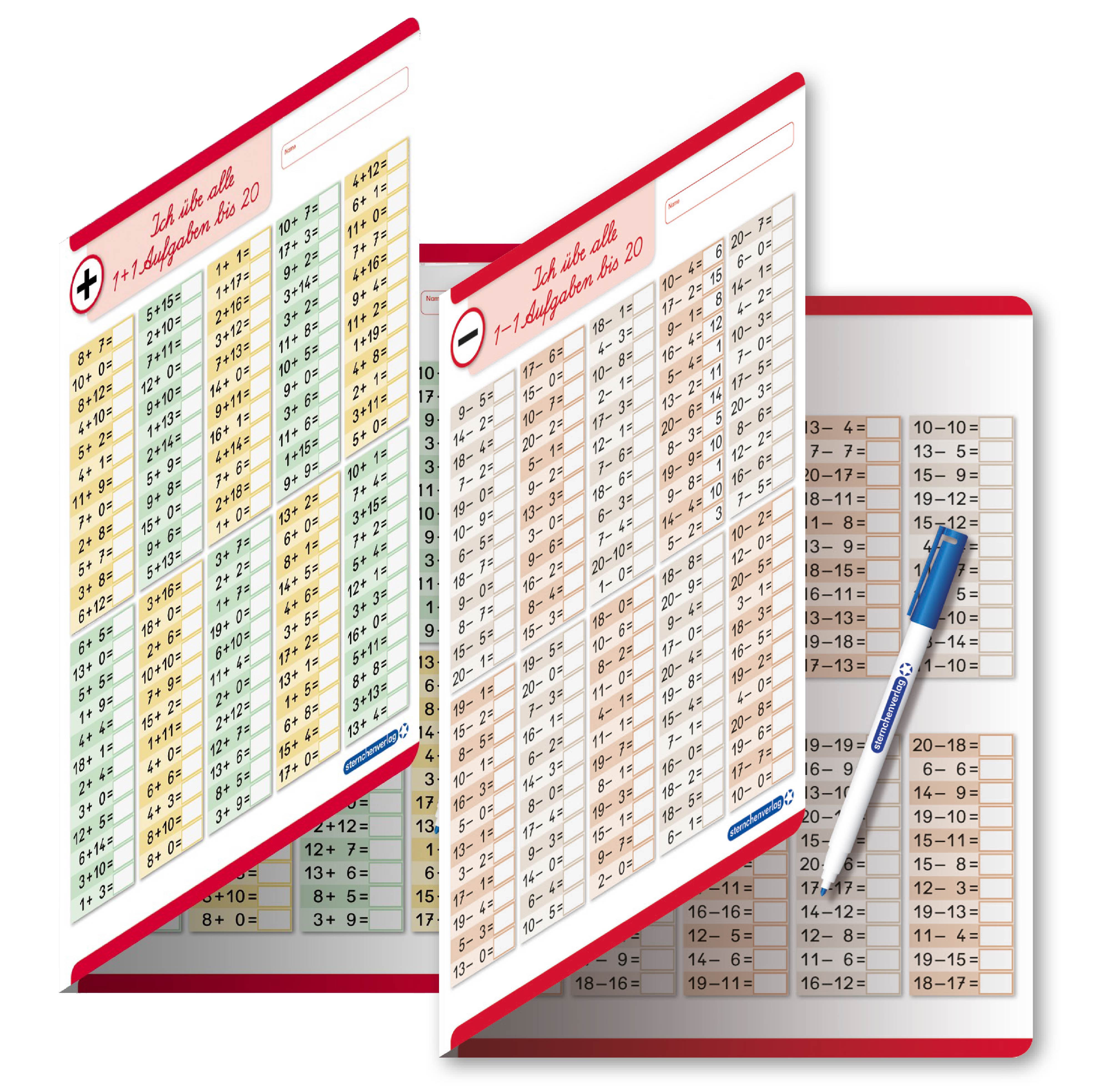 Ich übe alle Additionsaufgaben + Ich übe alle Subtraktionsaufgaben im Zahlenraum bis 20 im Set - Lerntafel mit Stift