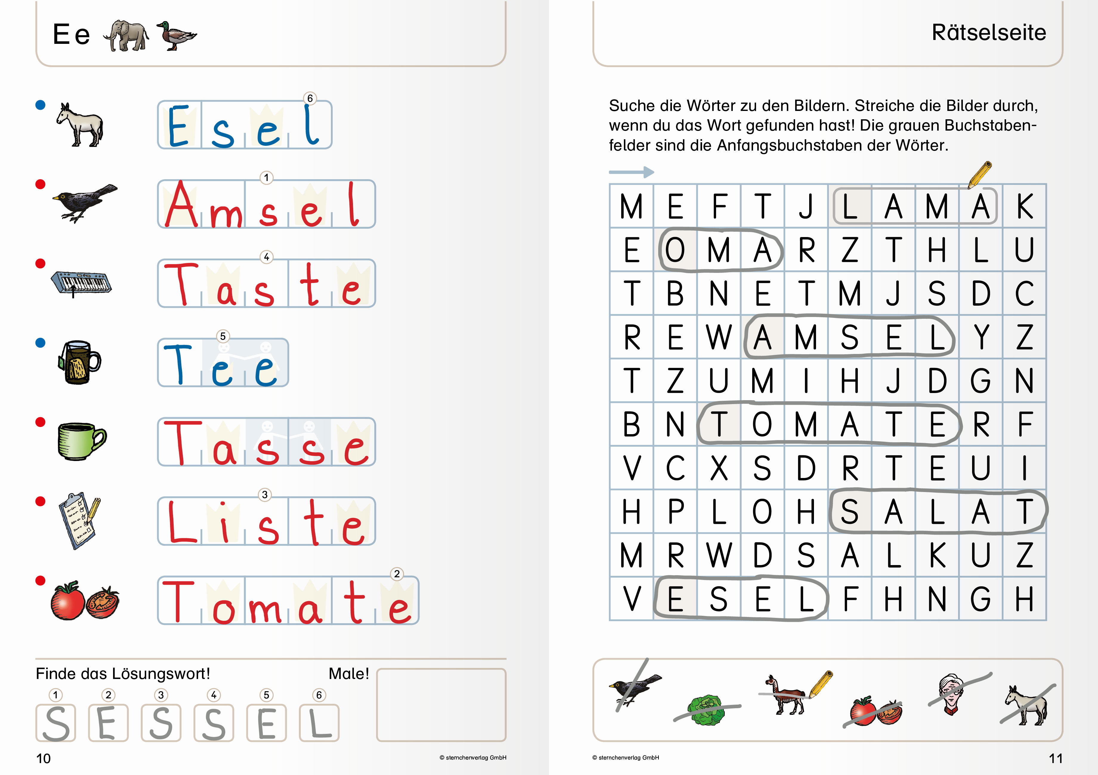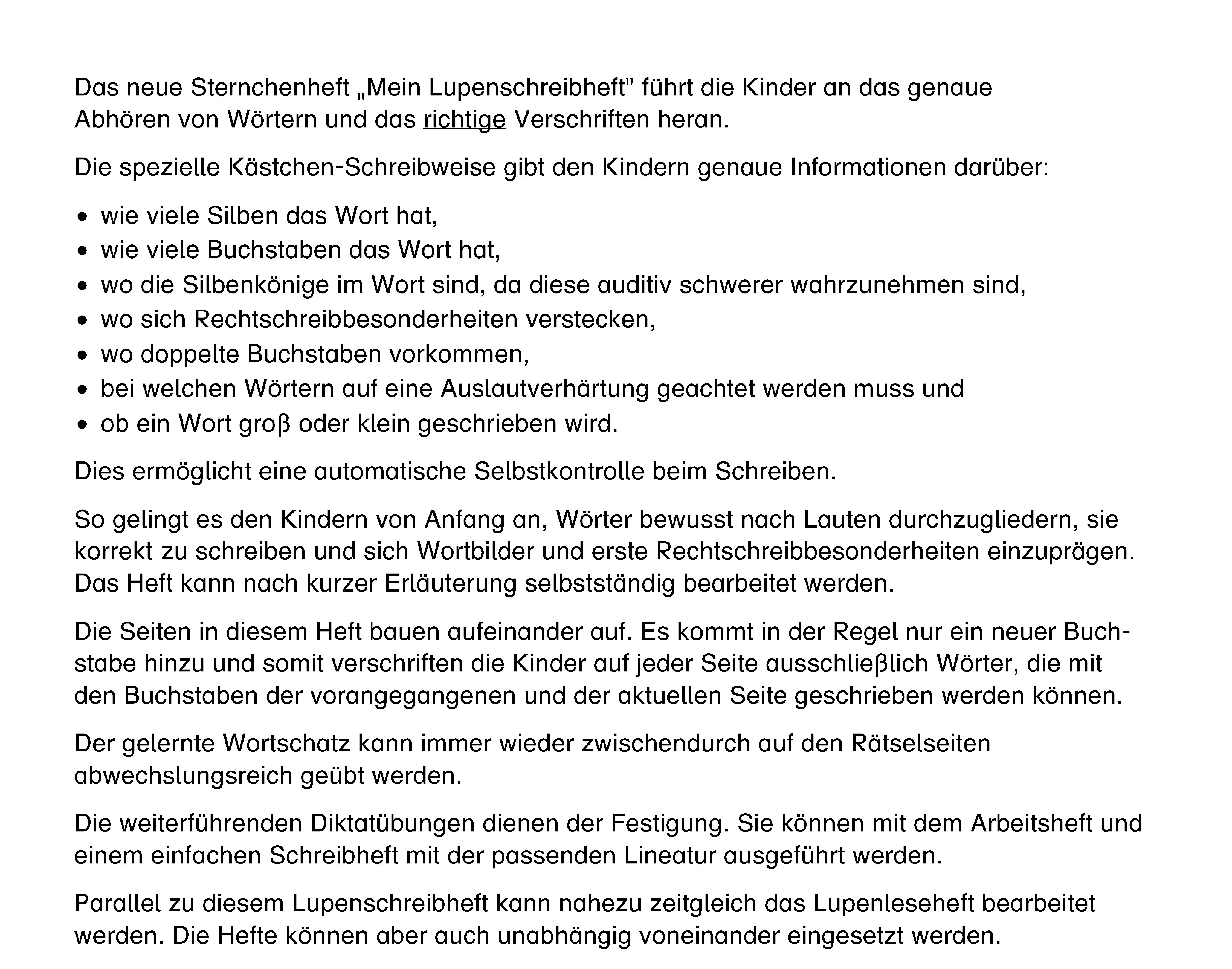 Das neue Sternchenheft führt die Kinder an das genaue Abhören von Wörtern und das richtige Verschriften heran. Die spezielle Kästchen-Schreibweise gibt den Kindern genaue Informationen über: Die Anzahl der Silben und Buchstaben im Wort, doppelte Buchstaben und die Rechtschreibbesonderheiten. Die Seiten in diesem Heft bauen aufeinander auf. Es kommt in der Regel nur ein neuer Buchstabe hinzu und somit verschriften die Kinder auf jeder Seite ausschließlich Wörter, die mit den Buchstaben der vorangegangenen und der aktuellen Seite geschrieben werden können.
