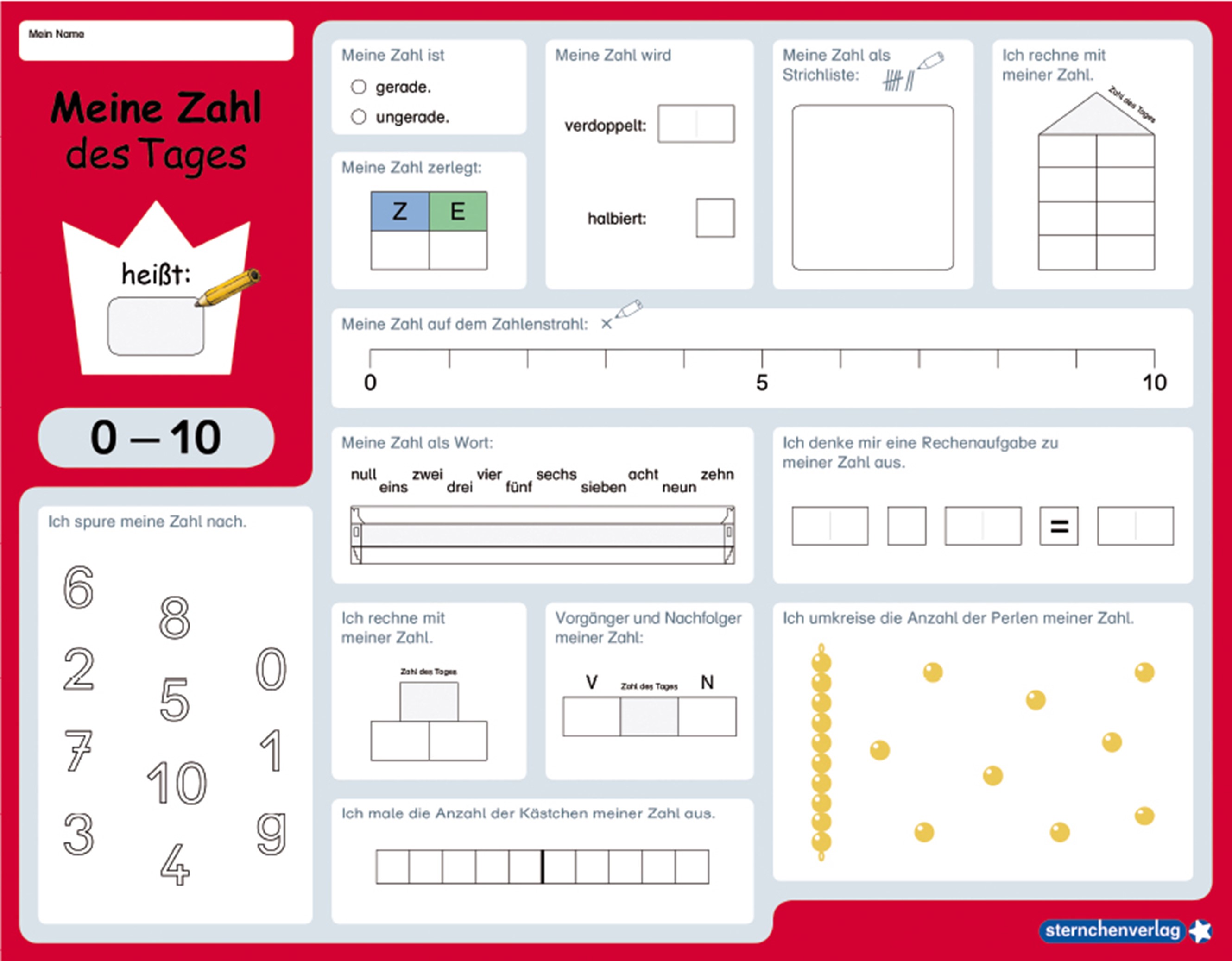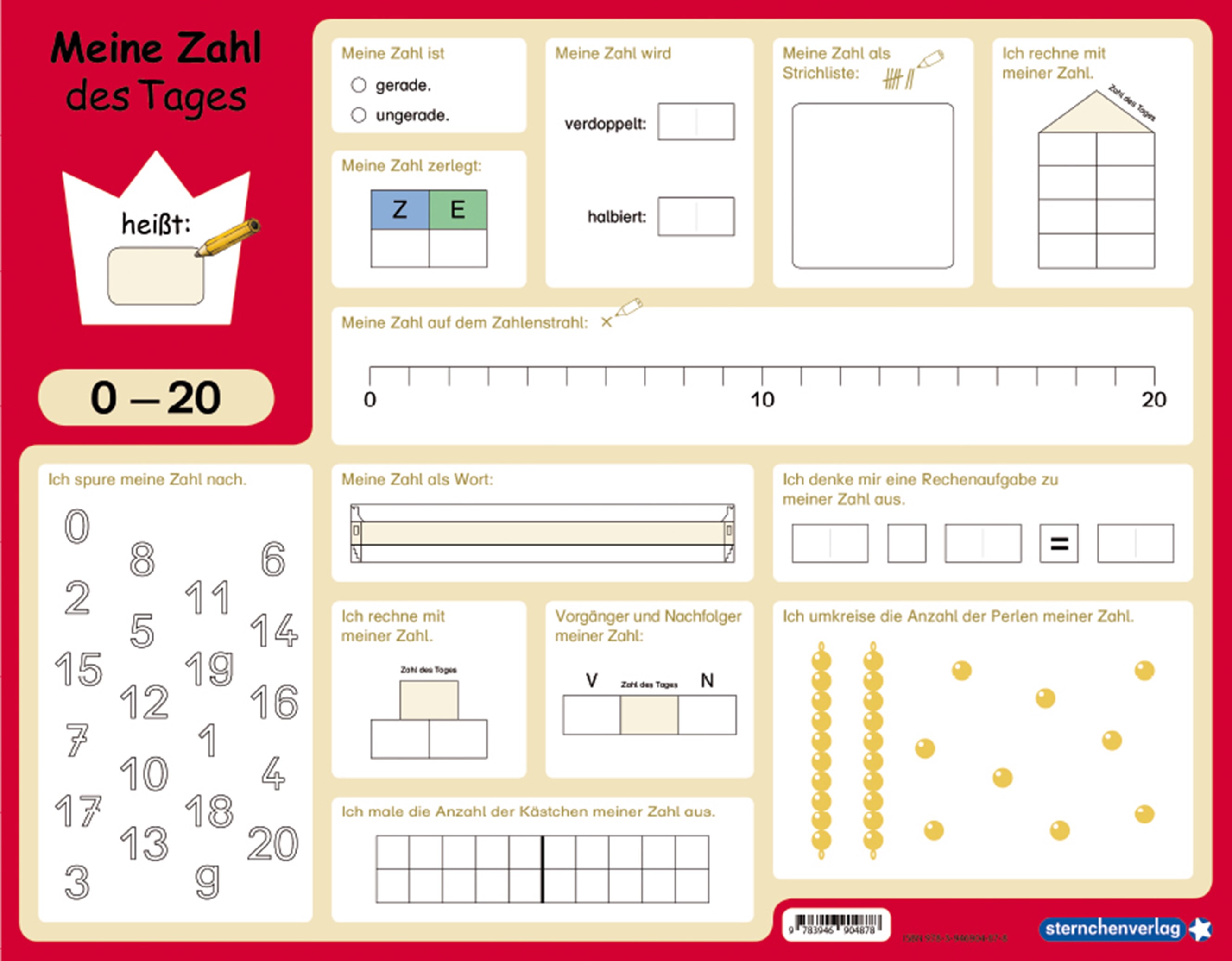 Jedes Kind kann auf dieser wiederbeschreibbaren Lerntafel zahlreiche Aufgaben zu der Zahl des Tages von 0 bis 10 (Vorderseite) und 0 bis 20 (Rückseite) mit Spaß und großem Lernerfolg üben. Sie wurde entsprechend dem Lehrplan von Lehrkräften entwickelt und ist bereits erprobt!